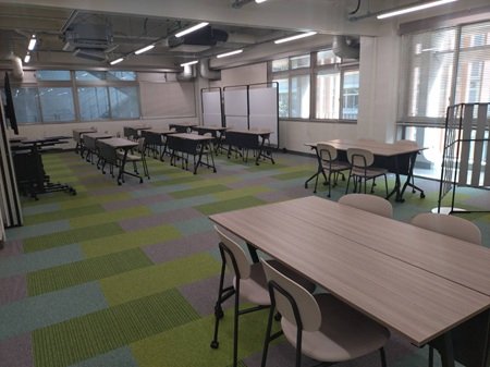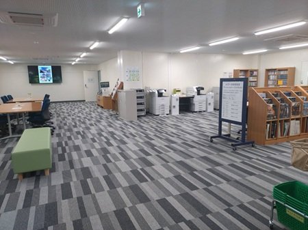 従来、新着雑誌・コピー機・AVブースが設置されていた2階エリアを、固定机のないフリースペース(共創スペース)として再編しました。可動式の間仕切りにより空間を柔軟に区分でき、教育・研究・地域連携など多様な用途に対応します。