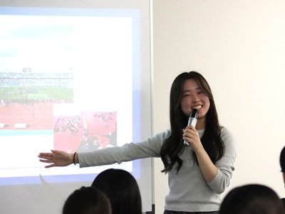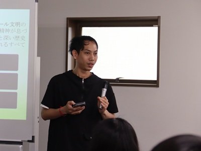 4月16日(木)の初回講義には、10以上の国・地域からの留学生と、北海道から沖縄まで全国各地から来ている日本人学生が集まりました。留学生2名、日本人学生3名がプレゼンテーションを行い、留学生は自国の文化について、日本人学生は留学・インターンシップ先の文化や留学で得られた経験について、それぞれ発表しました。ミャンマー、カンボジア、韓国、ネパール、アメリカの文化が、食や挨拶など身近な切り口から紹介されました。その後、受講者全員が自身の出身地や所属学部なども交えながら自己紹介を行い、互いの理解を深めました。