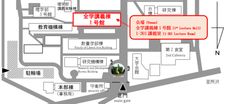埼玉大学構内 懇親会:第1食堂 ▲全学講義棟1号館301講義室への道順 |