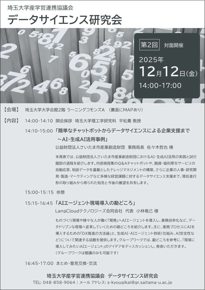 | 内容 | 14:00-14:10 開会挨拶 埼玉大学理工学研究科 平松薫 教授 14:10-15:00 簡単なチャットボットからデータサイエンスによる企業支援まで~AI・生成AI活用事例 公益財団法人さいたま市産業創造財団 事務局長 佐々木哲也 様 15:00-15:15 <休憩> 15:15-16:45 AIエージェント現場導入の勘どころ LangCloudテクノロジーズ合同会社 代表 小林竜己 様 16:45-17:00 まとめ・意見交換・交流 |