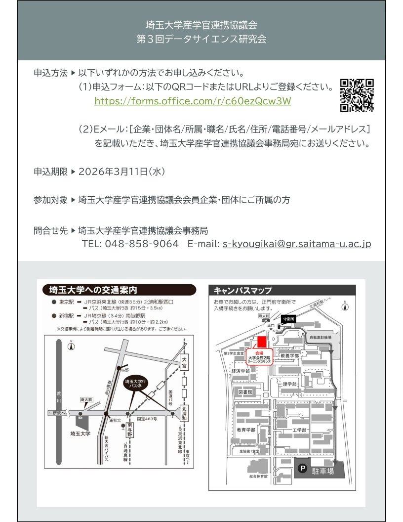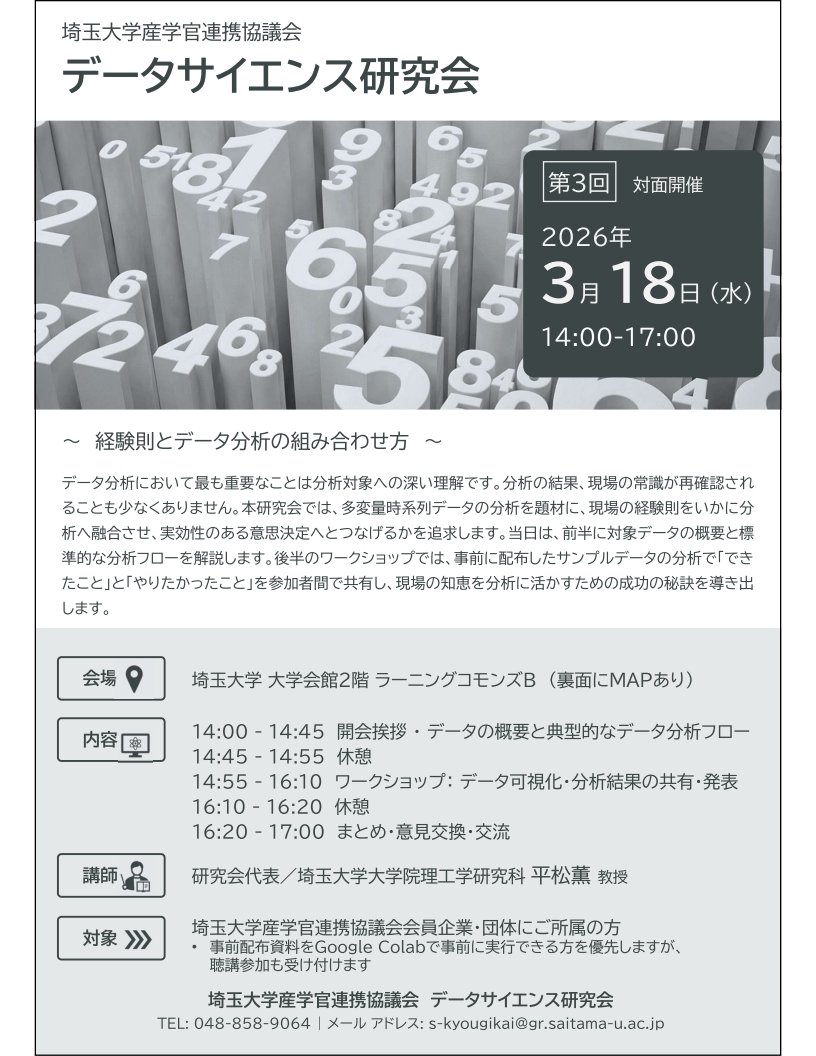 | 対象 | 埼玉大学産学官連携協議会会員企業・団体にご所属の方 • 事前配布資料をGoogle Colabで事前に実行できる方を優先しますが、聴講参加も受け付けます |