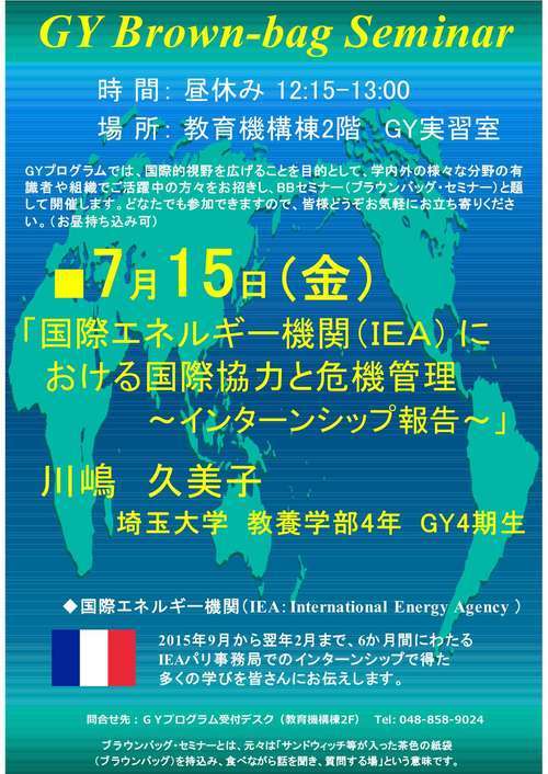 GYプログラムでは、国際的視野を広げることを目的として、学内外の様々な分野の有識者や組織でご活躍中の方々をお招きし、BBセミナー(ブラウンバッグ・セミナー)と題して開催します。どなたでも参加できますので、皆様どうぞお気軽にお立ち寄りください。(お昼持ち込み可)