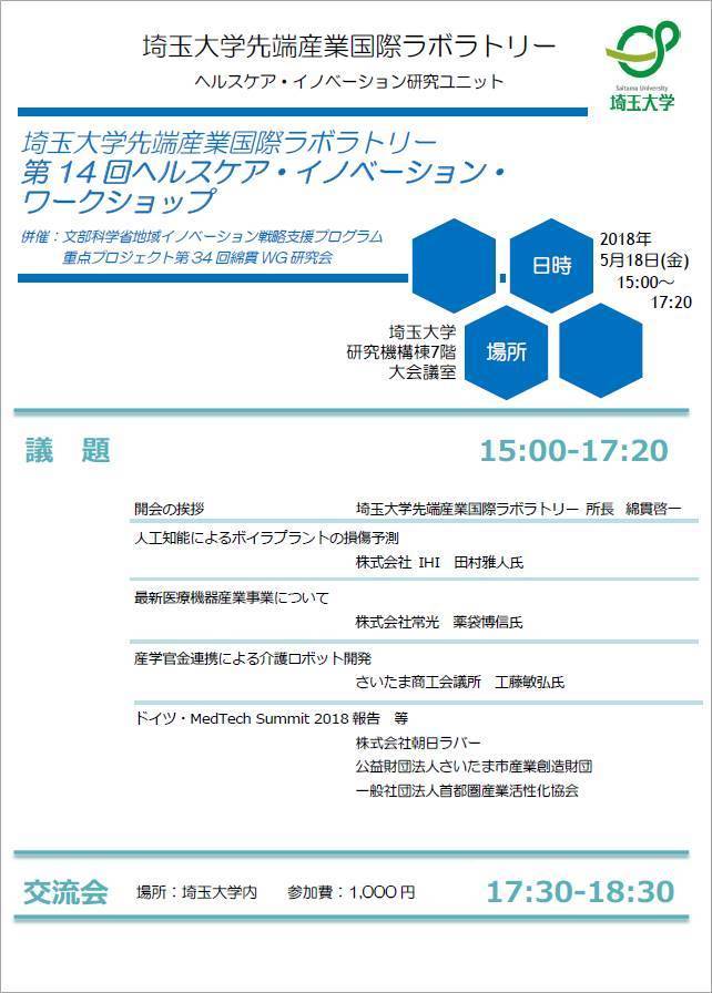 〇ワークショップ 15:00-17:20 1.開会の挨拶 埼玉大学先端産業国際ラボラトリー 所長 綿貫啓一 2.人工知能によるボイラプラントの損傷予測 株式会社 IHI 田村雅人氏 3.最新医療機器産業事業について 株式会社常光 薬袋博信氏 4.産学官金連携による介護ロボット開発 さいたま商工会議所 工藤敏弘氏 5.ドイツ・MedTech Summit 2018報告 等 株式会社朝日ラバー 公益財団法人さいたま市産業創造財団 一般社団法人首都圏産業活性化協会 〇交流会 17:30-18:30 場所:埼玉大学内 参加費:1,000円 |