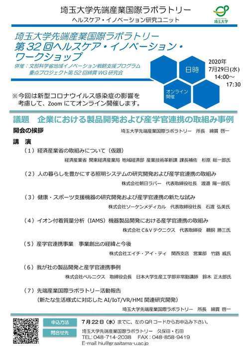 埼玉大学先端産業国際ラボラトリー第32回ヘルスケア・イノベーション・ワークショップ(併催:文部科学省地域イノベーション戦略支援プログラム 重点プロジェクト第52回綿貫WG研究会)を下記のとおり開催いたします。今回は新型コロナウイルス感染症の影響を考慮して、Zoomにてオンラインで開催いたします。
