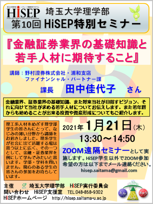 2021年第1回目のHiSEPセミナーは、1月21日(木)13時30分からZOOMで開催します。理工系学生の皆さんが社会と接点を持つことを目的として、これから社会に出る学生の皆さんに向けて、少しなじみの薄い、金融・証券業界から講師をお招きします。