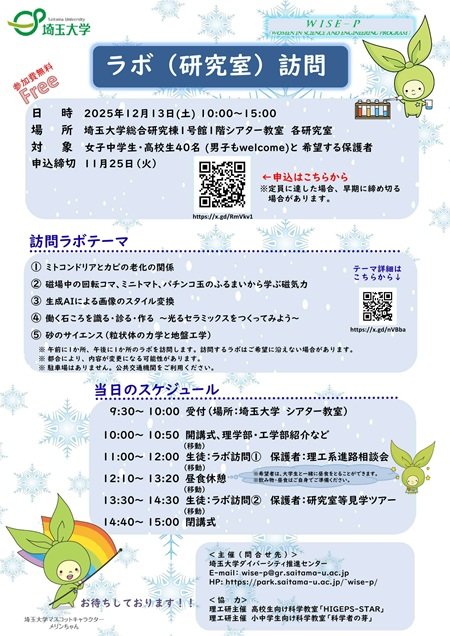| 問い合わせ先 | 埼玉大学ダイバーシティ推進センター E-mail:wise-p@gr.saitama-u.ac.jp  |