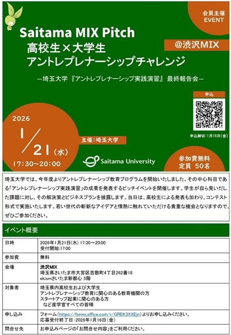【1月21日(水)】Saitama MIX Pitch–高校生×大学生アントレプレナーシップチャレンジ―埼玉大学アントレプレナーシップ実践演習 最終報告会―開催のご案内