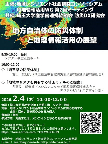 【2月4日(木)】地域レジリエント社会研究コンソーシアム 地理情報活用WG 第2回ミーティング「地方自治体の防災体制と地理情報活用の展望」を開催します