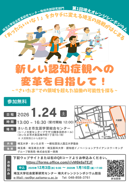 「共生社会の実現を推進するための認知症基本法」が施行され、「認知症との地域共生社会」実現のために必須となる『新しい認知症観への変革』を目指し取り組んでいくべき内容について産官学民のそれぞれの視点から議論を交わすため、このたび、さいたま市、一般社団法人国立大学協会共催のもとシンポジウムを開催いたします。是非ご参加ください。