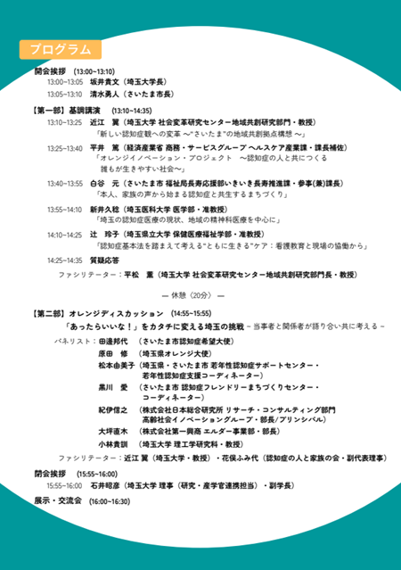 | プログラム | 13:00-13:10 開会挨拶 13:10-14:35 【第一部】基調講演 ・近江 翼(埼玉大学 社会変革研究センター地域共創研究部門・教授) ・平井 篤(経済産業省 商務・サービスグループ ヘルスケア産業課・課長補佐) ・白谷 元(さいたま市 福祉局長寿応援部いきいき長寿推進課・参事(兼)課長) ・新井久稔(埼玉医科大学 医学部・准教授) ・辻 玲子(埼玉県立大学 保健医療福祉学部・准教授) 14:35-14:55 休憩 14:55-15:55 【第二部】当事者を含めたパネルディスカッション 「あったらいいな!」をカタチに変える埼玉の挑戦 ~ 当事者と関係者が語り合い共に考える ~ <パネリスト> 15:55-16:00 閉会挨拶 16:00-16:30 展示・交流会 |