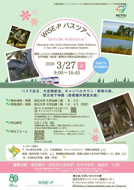 Girls Be Ambitious!Discovering How Social Infrastructure Builds Resilience: A Tour with Saidai International Students(発見!レジリエンス社会を支える埼玉県のインフラストラクチャー:女子中高生・埼大生・留学生との多文化交流も目的として) 参加者募集
