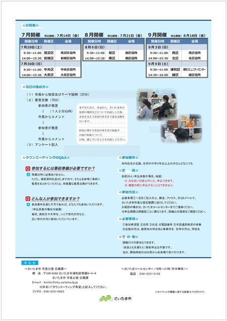 さいたま市が主催する平成29年度さいたま市タウンミーティングが下記のとおり開催されますのでお知らせいたします。さいたま市長と直接意見交換できる機会ですので、是非ご参加ください。