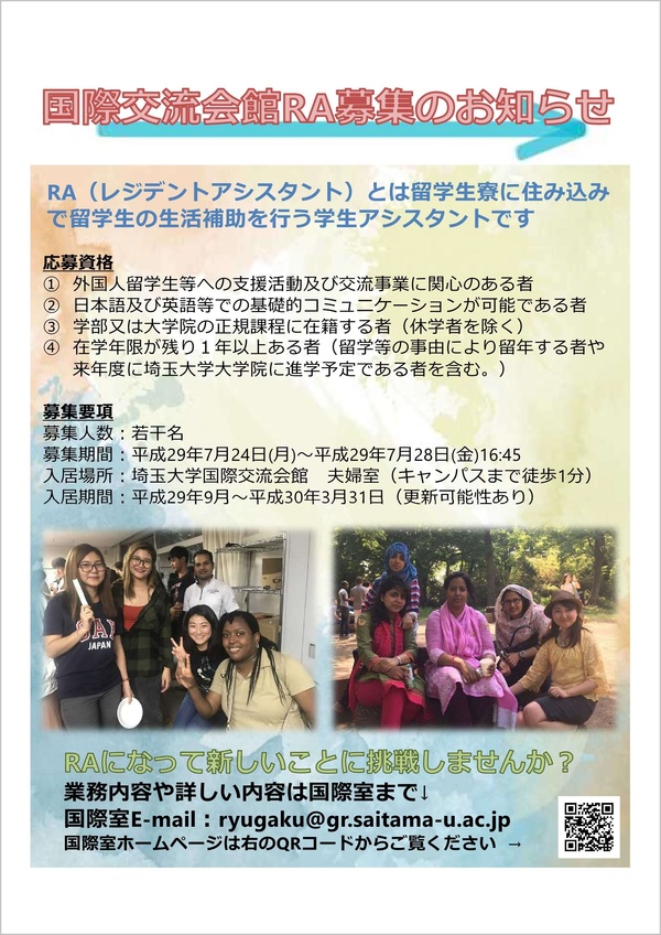 (1)レジデント・アシスタント募集要項 (2)RA申請所 (3)間取り図 (4)国際交流会館写真(ZIPファイル) (5)国際交流会館RAとは? (6)よくある質問 |