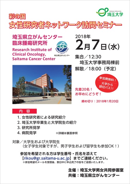 【2月7日(水)】彩の国女性研究者ネットワーク訪問セミナー(埼玉県立がんセンター)のお知らせ