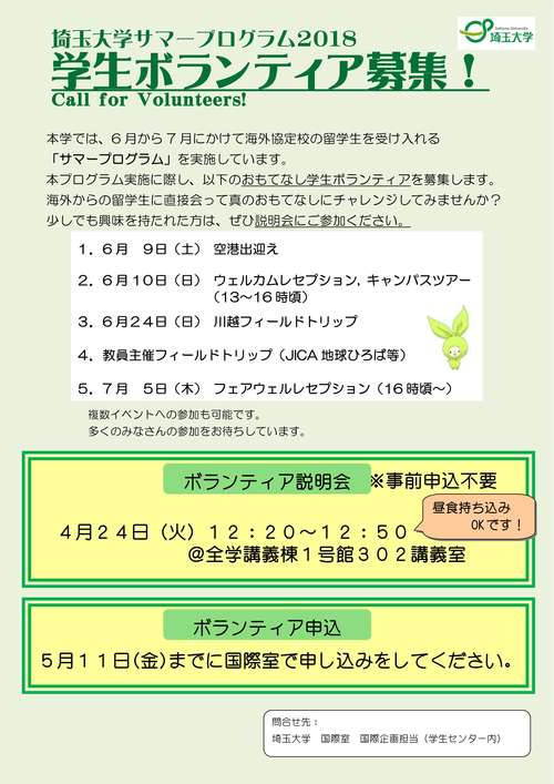 本学では6月から7月にかけて海外協定校の留学生を受け入れる「サマープログラム」を実施しています。本プログラム実施に際し、おもてなし学生ボランティアを募集します。