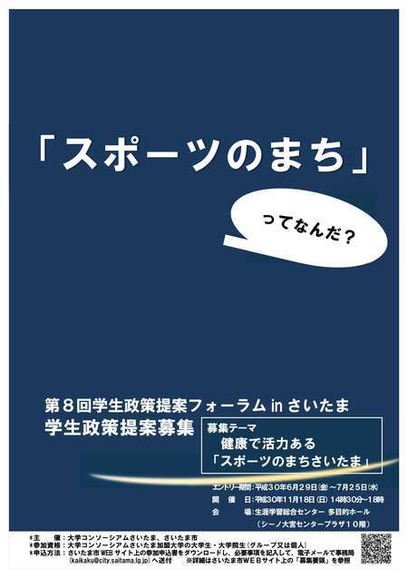 今回は、健康で活力ある「スポーツのまちさいたま」をテーマとし、市民が健康で生きがいを持って心豊かに暮らせる地域づくりのため、スポーツを生かしたまちづくりをテーマとして、学生ならではの柔軟な発想力や専門的な知識を活かした魅力的・創造的な提案を募集しますので、みなさまの応募をお待ちしています。