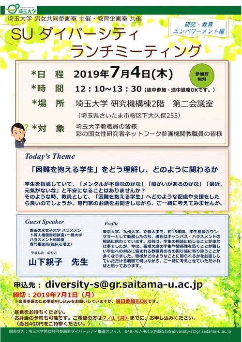 電子メール(diversity-s@gr.saitama-u.ac.jp)による事前申込みをお願いします。※7月1日(月)締切 ※会場準備のため事前申込をお願いしていますが、当日参加もOKです。 |