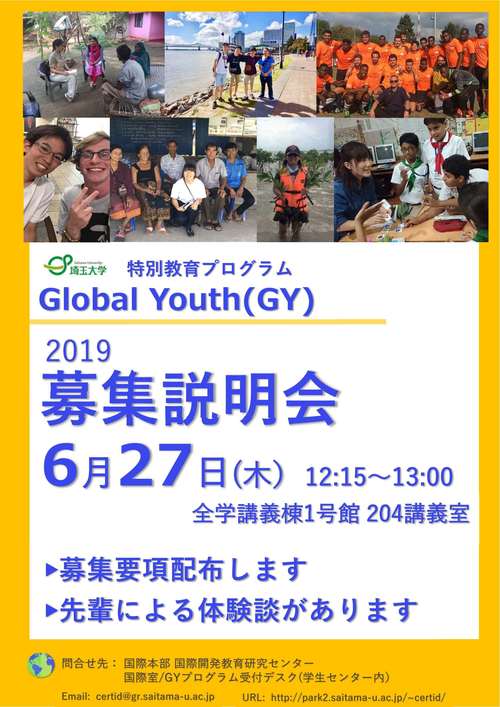 埼玉大学特別教育プログラムGlobal Youth(GY)の募集説明会を以下のとおり開催します。当日は、募集要項を配布し、現GY生による体験談も予定しています。昼食をとりながらの参加も可能ですので、皆さんの参加をお待ちしています。