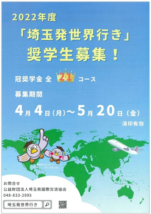 2022年度「埼玉発世界行き」奨学生の募集が、4月4日(月)より開始されました。
