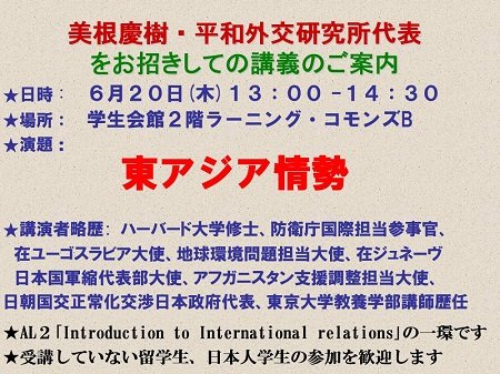 教養・スキル・リテラシー科目の講義「Introduction to International Relations」(コーディネーター:埼玉大学フェロー 加藤 基氏)の一環として、平和外交研究所代表の美根慶樹氏をお招きし、「東アジア情勢」と題した講義を行います。
