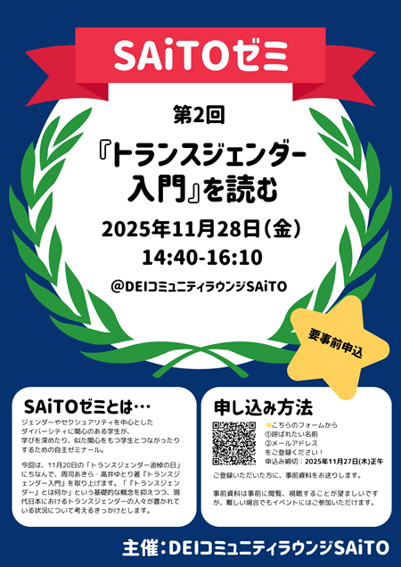 【11月28日(金)】ジェンダーやセクシュアリティについて学ぶ「第2回SAiTOゼミ」開催のお知らせ