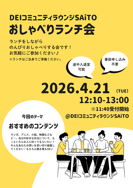 | 場所 | DEIコミュニティラウンジSAiTO (研究機構棟3階309) |