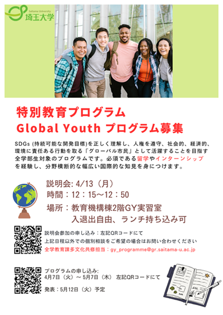 | 問合せ先 | 全学教育課 多文化共修担当:gy_programme[@]gr.saitama-u.ac.jp ([@] を@に変換してください) |