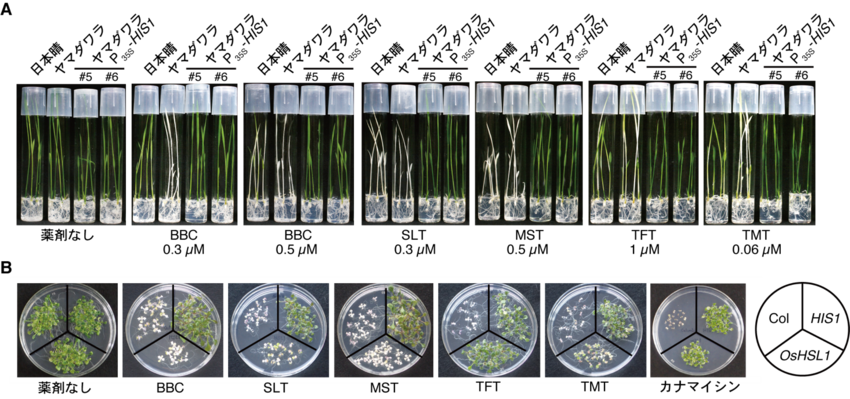 A. HIS1遺伝子に28塩基欠失を持つやまだわらは、BBCをはじめとする5種のトリケトン系除草剤に試験した濃度条件で感受性を示すが、日本晴型HIS1遺伝子を強発現することにより(やまだわら P35S-HIS1)、5種全ての薬剤に抵抗性を獲得する。B. シロイヌナズナ(Arabidopsis thaliana Columbia)は、5種全てのトリケトン系除草剤に感受性であるが、日本晴型HIS1遺伝子を強発現することにより、5種全ての薬剤に抵抗性を獲得する。さらに、日本晴型OsHSL1遺伝子を強発現することにより、TFTにのみ抵抗性を獲得する。