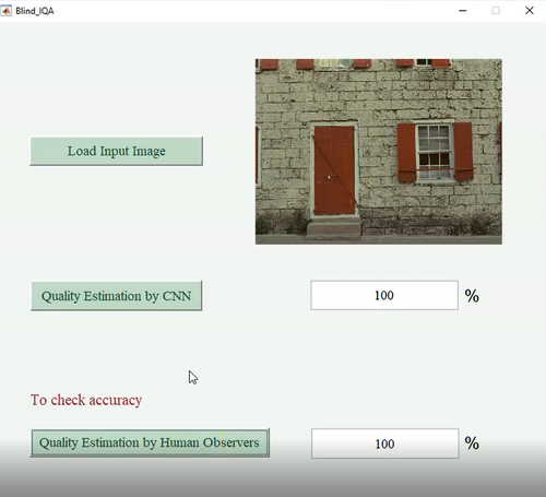 画像ファイルを指定後、「Quality Estimation by CNN」ボタンを押すと、本アルゴリズムにより出力した画像品質値を出力します。なお、「Quality Estimation by Human Oservers」をクリックすると、デモ用に人間が実際に主観評価した値が出力されます。