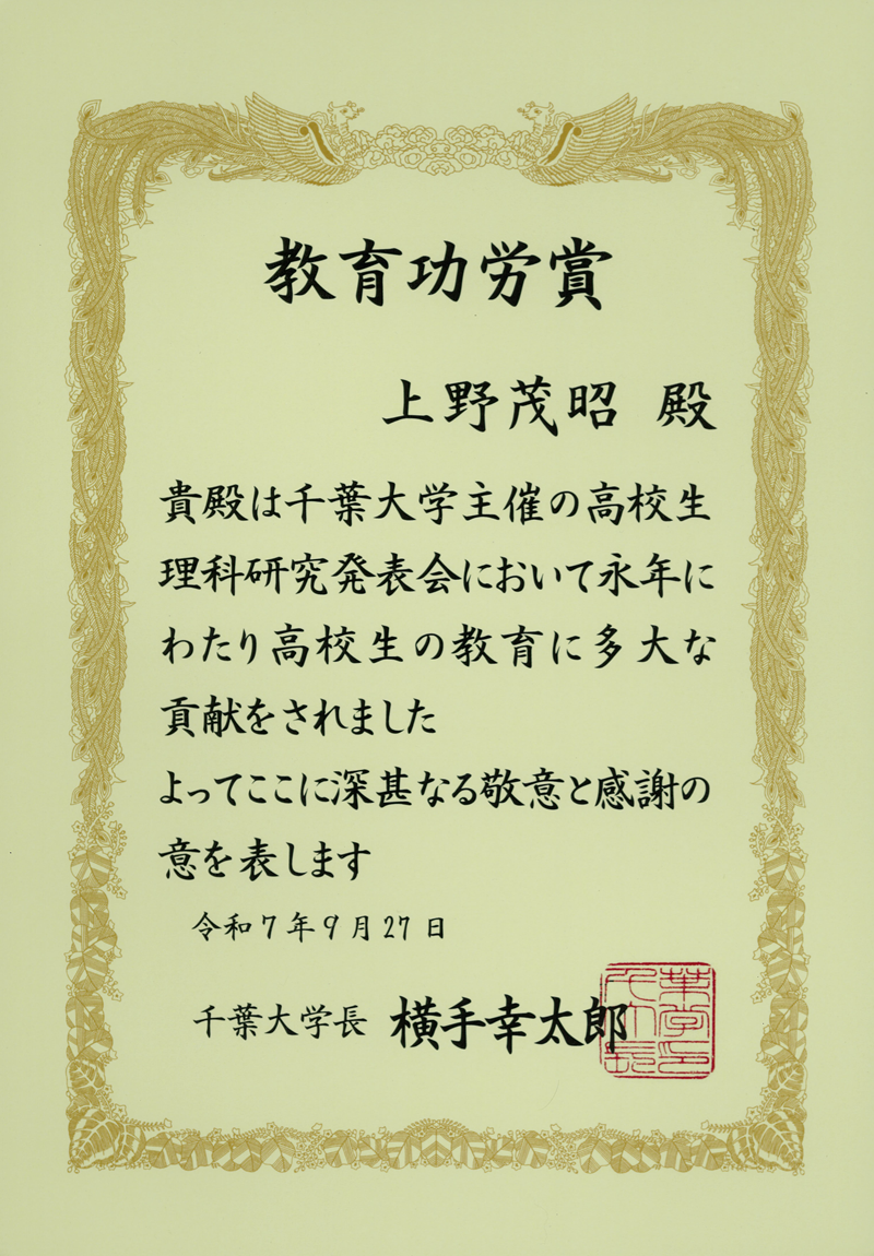上野准教授は審査委員として本発表会に参加し、高校生に対し質問や助言を行うとともに発表を審査しました。このたび永年にわたる高校生の教育に多大な貢献に対し、千葉大学教育功労賞が贈られました。