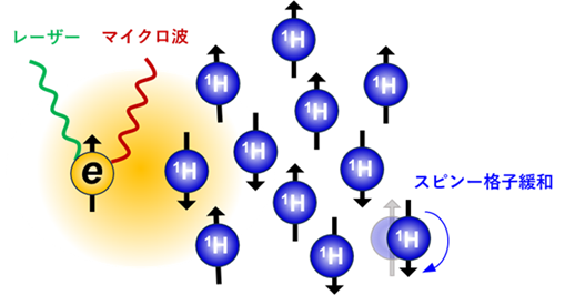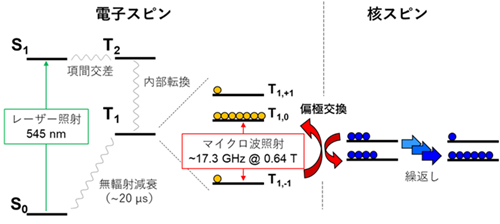 レーザー照射などの光励起によって生じる三重項励起状態([4]参照)の電子スピンは、複数のスピンが一つの準位に大きく偏った高いスピン偏極を持つ。このスピン偏極をマイクロ波照射と磁場掃引(じばそういん)によって核スピンへ移すことで、超核偏極状態をつくり出すことができる。