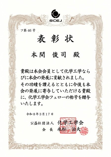| 受賞名 | 化学工学会2025年度(令和7年度)フェロー表彰 |