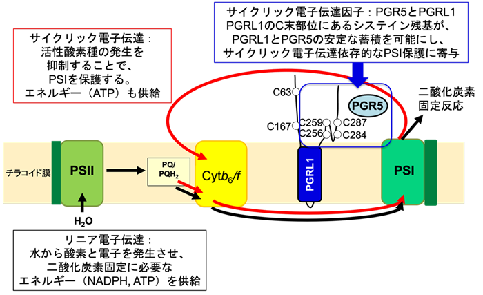 - 本研究では、このしくみに関わるタンパク質PGRL1の一部(C末端部位のシステイン残基)が、PGRL1自身やパートナーであるPGR5を安定に保つために不可欠であることを明らかにしました。